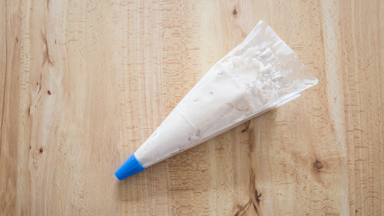 - Transfer the mixture to a piping bag with a round tip or a zip top bag with a hole cut into one corner.