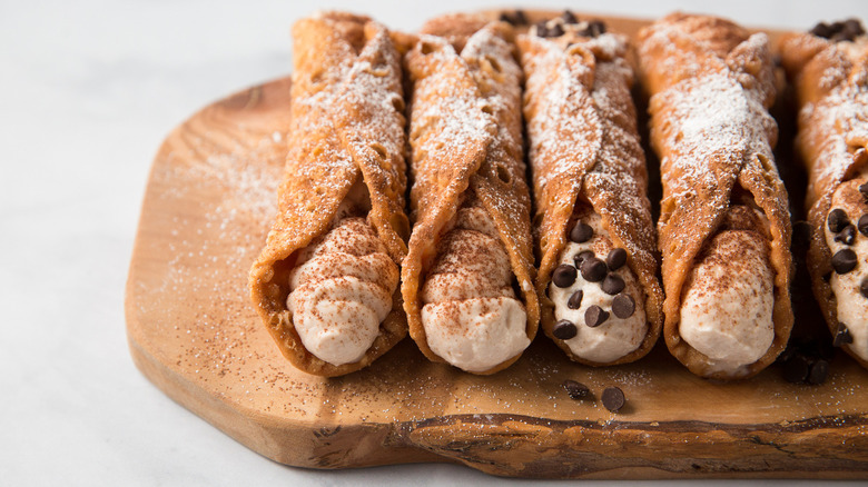 While there's nothing like traditional Sicilian cannoli, cooks abroad sometimes draw inspiration from fusion cuisine to create something new. Recipe developer Michelle Bottalico has created a recipe for tiramisu cannoli that blends elements from traditional cannoli and tiramisu, an Italian coffee-flavored dessert. A small quantity of strong espresso is added to the filling to give it a signature taste and a darker color. Rather than a ricotta-only filling, this cannoli filling also contains mascarpone and freshly whipped cream to channel the rich and creamy elements of tiramisu. The filling makes just enough for eight cannoli, so don't go overboard with the taste testing. We promise that waiting for the delicious finished result will be worth it.