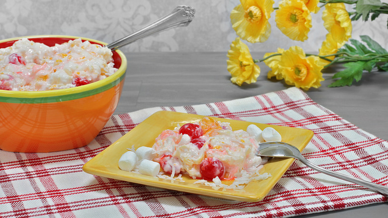 Brown's take on the dish also features standard ingredients, including sour cream, mini marshmallows, clementine segments, chopped pineapple, pecans, and cherries, placing the mixture in a glass serving bowl once it's combined. From there, he refrigerates the mixture for at least two hours before serving. It's as simple as that.