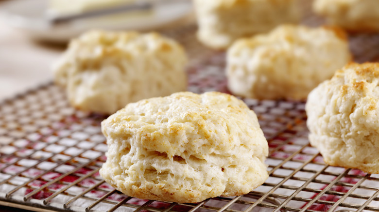 Chick-fil-A's scratch-made biscuits are created similarly to any other fluffy southern biscuit recipe. Team members begin by pouring a special biscuit mix into a large mixing bowl with 32 ounces of ice water, setting the mixer to combine the ingredients for only 18 seconds on a low speed. After dusting the workspace with self-rising White Lily flour, the cook will remove the biscuit dough from the bowl and gently work until it's flat. Once flat, the dough is folded in on itself several times to create air pockets that leave the biscuit fluffy and flaky. The dough is flattened again, cut into biscuit shapes with a circular tool, then moved to a buttered tray for baking until it reaches golden perfection.