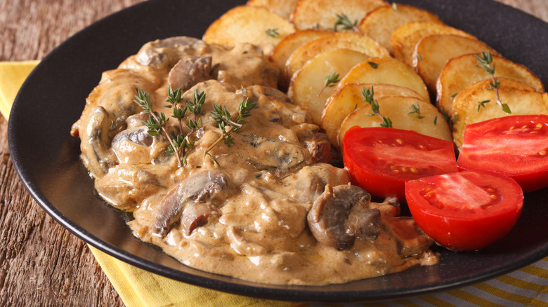 As they're generally served today, both of these classic dishes consist of a pan-fried steak with a creamy pan sauce. The key difference is that the sauce from a steak Diane often includes mushrooms, while the steak au poivre, as the name suggests, makes use of a peppercorn sauce. But depending on who you ask, and even in which decade the question was posed, these two steak dishes might have more to separate them, including the cut of steak used and how the dish is prepared. They differ in origin too — steak au poivre is considered a classic of French cuisine, while the details behind the creation of steak Diane are up for debate.