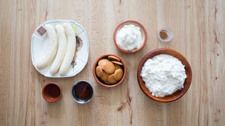 For the pudding, you will first need cottage cheese, and you can choose any percent fat you prefer. You'll also need ripe bananas, vanilla extract, maple syrup, and cinnamon. For the layers and topping, gather a large ripe banana and vanilla cookies.