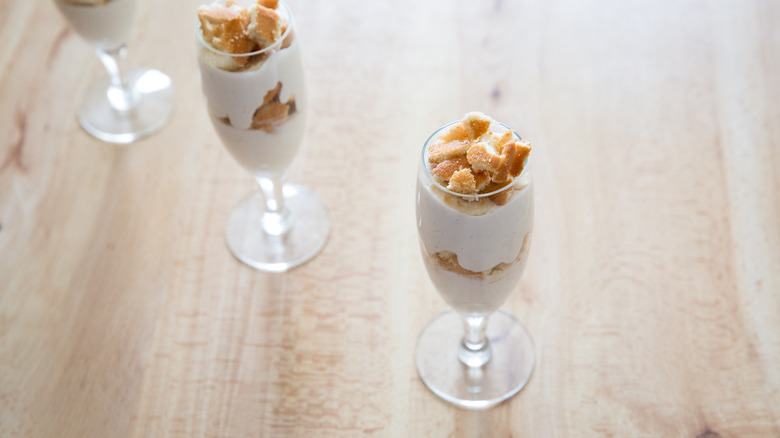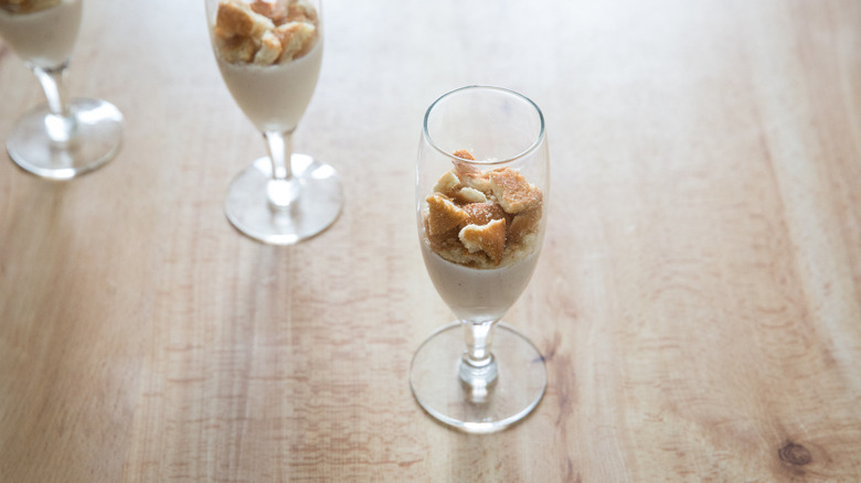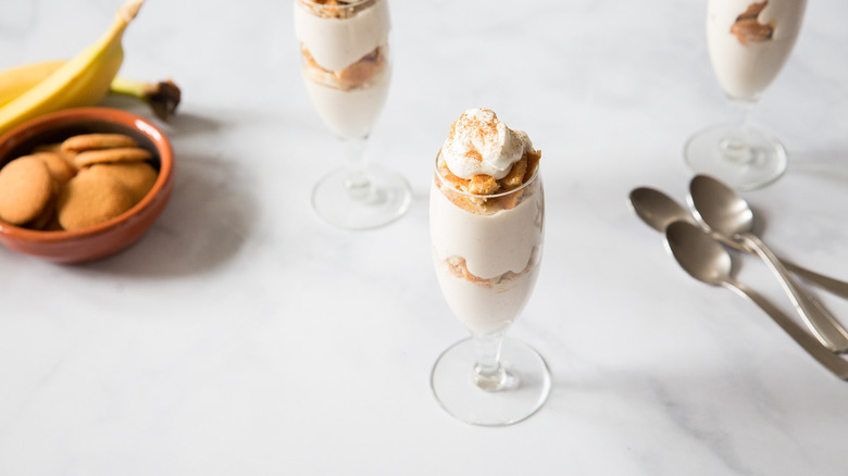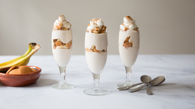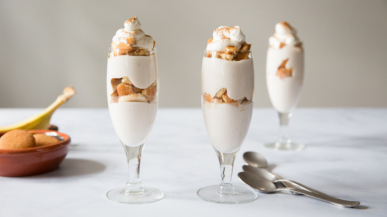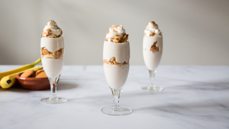 The pudding is flavored with ripe bananas, vanilla extract, and cinnamon, and it's naturally sweetened with a little maple syrup. It turns out thick, creamy, rich, sweet, and fruity all at once. You could simply blend the ingredients and serve it as is, but the recipe goes a step further to create beautiful layers in parfait glasses. The pudding is layered with sliced fresh banana and crumbled vanilla cookies, and a final topping of whipped cream and sprinkled cinnamon makes this dessert picture perfect. In even more good news, you can make this pudding in the blender and assemble the layers in less than 20 minutes, so it's an easy way to create an impressive dessert without spending hours in the kitchen.