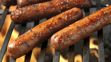 Beef hot dogs begin with meat trimmings. These are the leftover bits and pieces that we get after steaks and roasts have been cut for retail sale. Unlike pork hot dogs, which are made from a process known as mechanical separation in which bones with meat are squeezed through sieves to produce a kind of sausage-stuffable meat paste, beef hot dogs follow different rules because of mad cow disease concerns. The beef trimmings are first ground super fine — way finer than your regular ground beef. Then, it's pumped into casings — either real ones from cleaned animal intestines (the old-school way) or artificial ones that get peeled off later.