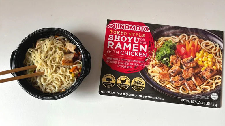 Ramen is such a delicious and comforting food, so it's a bit of a shock that the Ajinomoto shoyu ramen bowl didn't turn out as a success. You can usually expect the broth to be flavorsome — salty and full of dimension — and that remains partially true for this dish. Yes, the broth was the most flavorful part of the dish, although not spectacular and a tad oily. It had a pleasant, umami, soy taste, which was our favorite part of this meal.