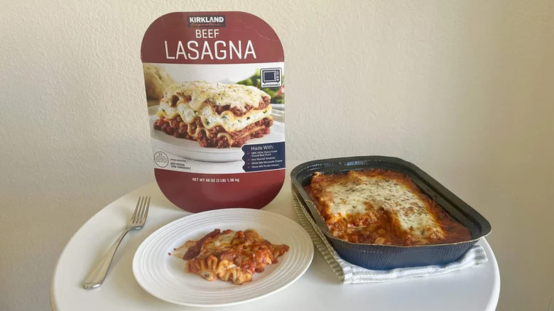 Lasagna is a robust dish that can be a familiar option to keep stocked in your freezer. Luckily, the Kirkland Italian sausage and beef lasagna brings a lot to the table. Literally. You'll get two 3-pound containers of the tomato sauce-laden dish — perfect to feed your crew and then some. You get a blend of cheese, beef, and sausage as your protein sources, so it doesn't feel like it's one-note. The two types of meat come together to offer a delicious salty and fatty dish to balance the acidity of the tomatoes.