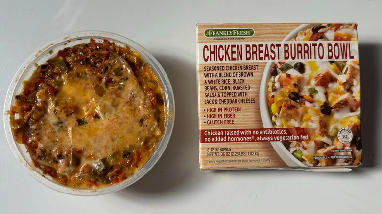 Burritos are such a well-known, scrumptious food, but sometimes you don't have a Mexican restaurant near you or simply don't want to leave the house. The Frankly Fresh chicken breast burrito bowl is a flavorful option when you want some Mexican-American flair from home. It's packed with ingredients like corn, black beans, salsa, cheese, rice, and, of course, the seasoned chicken breast.