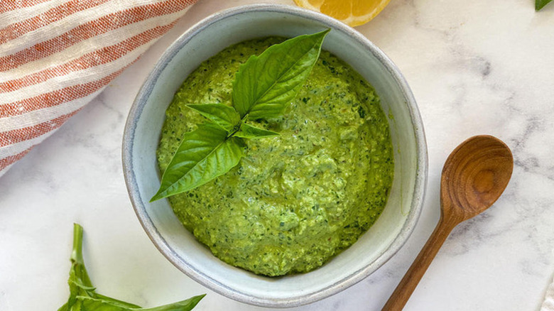 This delicious sauce will also work especially well tossed through seafood pasta dishes, such as shrimp spaghetti, perhaps with some juicy cherry tomatoes and tender asparagus. Plus, whipping up pesto from scratch couldn't be simpler. Start by toasting pine nuts in a skillet for a few minutes until golden, then blitz these up in a food processor along with some fresh basil leaves, Parmesan cheese, garlic, and olive oil. Season with salt to taste, and feel free to add a squeeze of lemon, too.