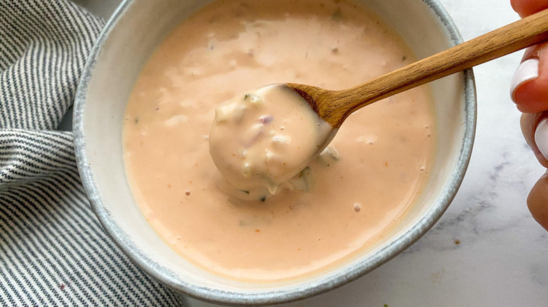 Again, we'd argue that making a homemade version beats most sore-bought varieties — and Thousand Island dressing takes just five minutes to whip up. You can make your own Thousand Island sauce by combining minced red onion and garlic, mayonnaise, ketchup, sweet relish, apple cider vinegar, and salt. It's a simple case of stirring everything together, then leaving the flavors to meld for an hour or so in the fridge before serving.