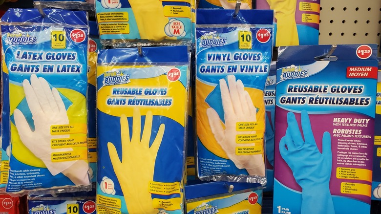 If you like using gloves for these and other kitchen-related cleaning tasks, you should be able to find what you're looking for at Dollar Tree. The store sells reusable and disposable options. If you have a latex allergy, you can also find vinyl gloves at Dollar Tree.
