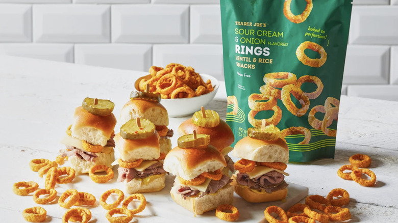 The Trader Joe's website pictures the rings as a topping for sliders. They'd work on burgers or even deli sandwiches. And there's also no reason you couldn't crush up the rings and coat your chicken cutlets or tenders in them before frying them to a tasty golden crisp in a pan. The best thing about the Trader Joe's Sour Cream and Onion rings is that they are not a seasonal item — they're available all year long, so you don't have to worry about hoarding enough bags to get you through multiple seasons.