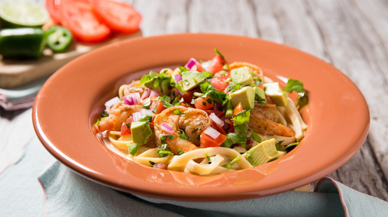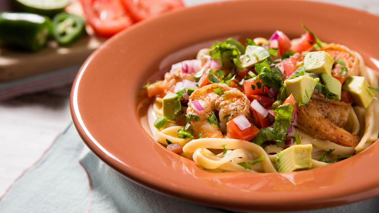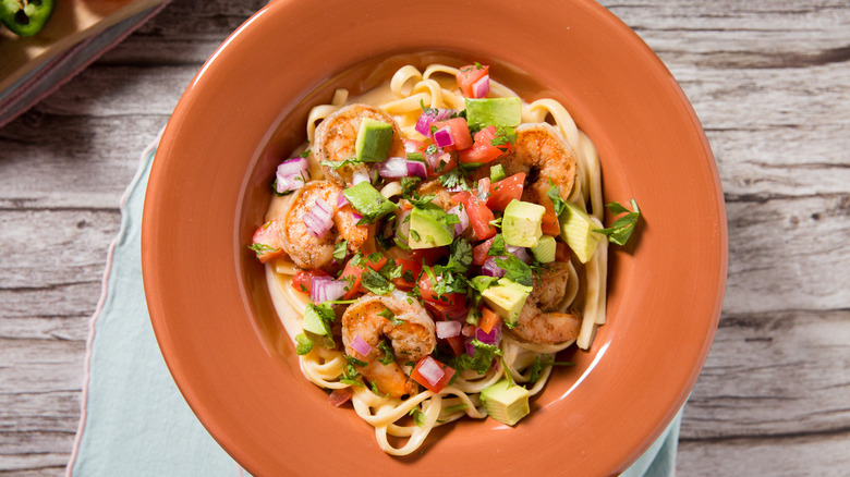 Fresh cilantro, avocado, and pico de gallo help brighten this spicy pasta dish that stars a Mexican-inspired shrimp alongside a creamy cheese sauce.