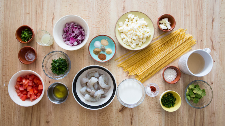 The first step of this recipe is making pico de gallo. You will need ripe plum tomatoes, red onion, jalapeño pepper, cilantro, lime juice, and salt. For the spiced shrimp, gather peeled and deveined shrimp, olive oil, chili powder, cumin, salt, garlic powder, onion powder, and black pepper. The pasta used in this recipe is fettuccine, and to make the sauce, you will need unsalted butter, all-purpose flour, milk, Monterey Jack, seafood broth, salt, and ground cayenne. Finally, have avocado and cilantro on hand for serving.