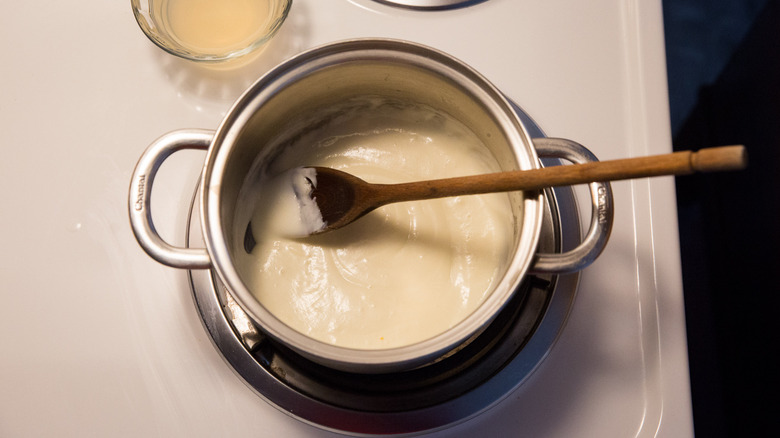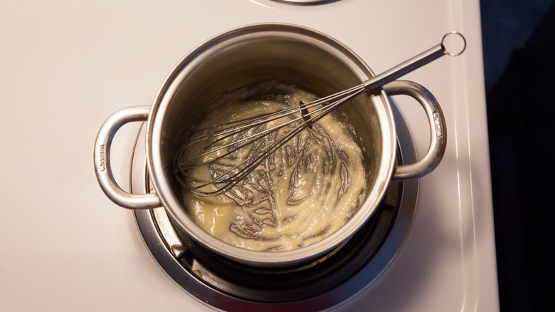 - Pour in the milk and whisk continuously for about 5 minutes, until the mixture thickens and starts to bubble.