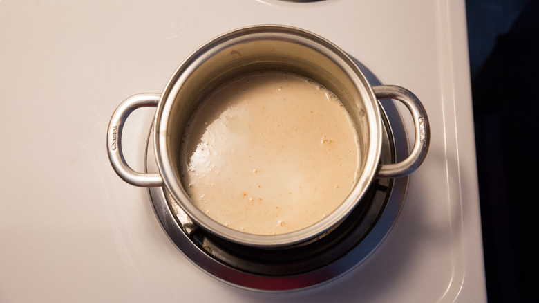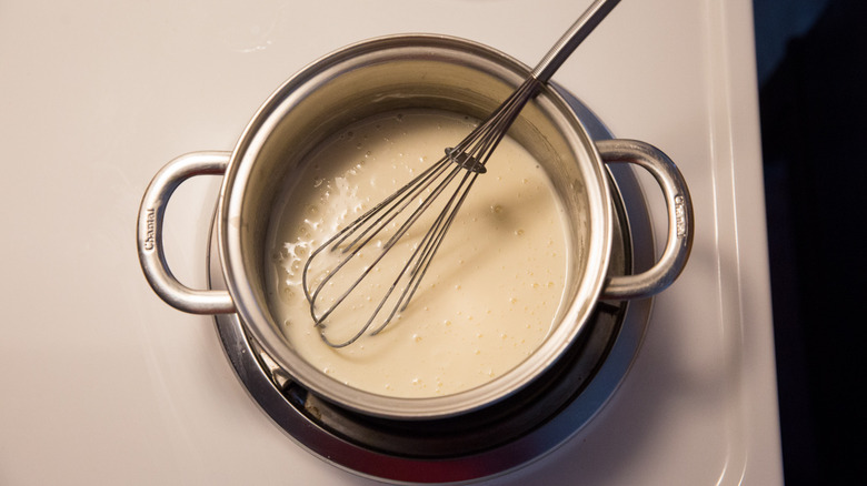 Pour in the milk and whisk continuously for about 5 minutes, until the mixture thickens and starts to bubble.