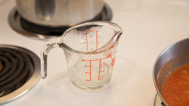 - When the pasta is almost done, scoop out ¼ cup of pasta cooking water and set aside.