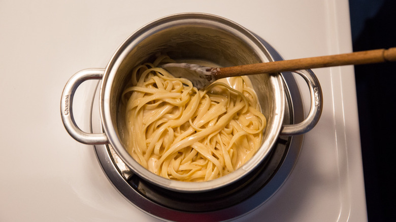 Stir in the salt and cayenne pepper. Keep the sauce warm on a warming burner or a burner set to low if the pasta isn't ready yet.