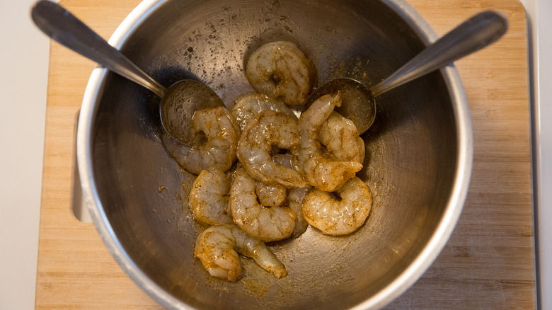 - While the water is heating, make the shrimp: Start by placing the shrimp, ½ tablespoon olive oil, and the spices in a large bowl. Toss until the shrimp are evenly coated.