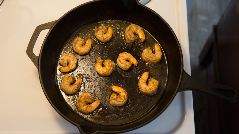 - Place the shrimp in a single layer and cook for 2 minutes per side, until the inside is opaque. Remove from the heat and set aside. Work in batches if you don't have a large pan.