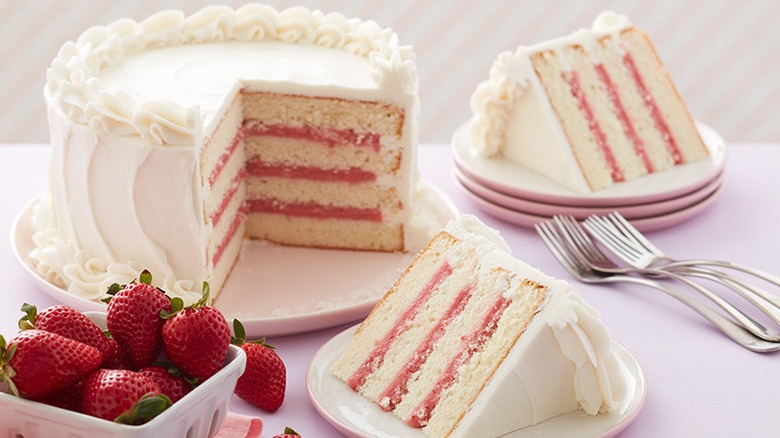 According to Folsom, another reason why your cake is leaning could be how you're frosting it. "If your cake is leaning during the frosting process," she said, "it's most likely become unbalanced when you added the filling between layers." As much as we all love a luscious buttercream or whipped frosting, Folsom advises not going overboard with it. Too much frosting adds weight to the cake, which can seep out and cause the layers to slip, especially if you're making a heavy multi-tiered cake. Another of Folsom's pro tips for frosting a cake is "inverting the top layer of the cake so the part with the cut-off dome is in the center. This provides a flatter surface to decorate on as well."
