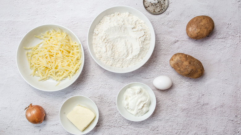 For the dough, you'll need all-purpose flour, salt, a large egg, sour cream, unsalted butter, and water as needed. For the filling, a pound of large russet potatoes peeled and cut into 1-inch chunks will be joined by shredded sharp cheddar cheese, unsalted butter, sour cream, salt, and pepper. Finally, for serving these pierogies, don't forget more butter and onions, along with optional sour cream and fresh herbs, such as dill.