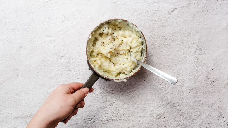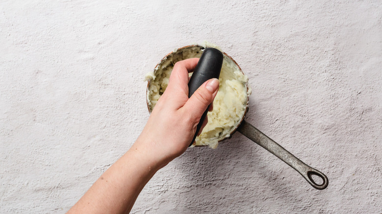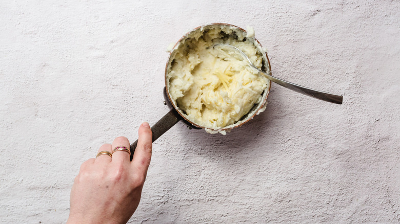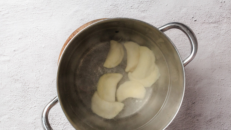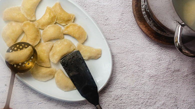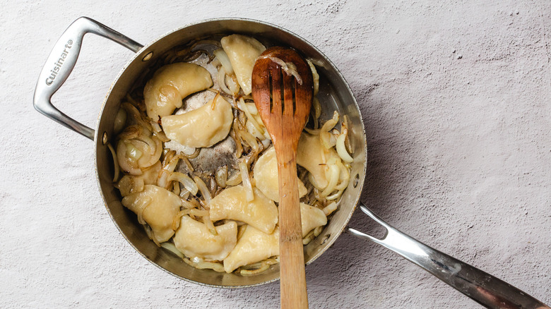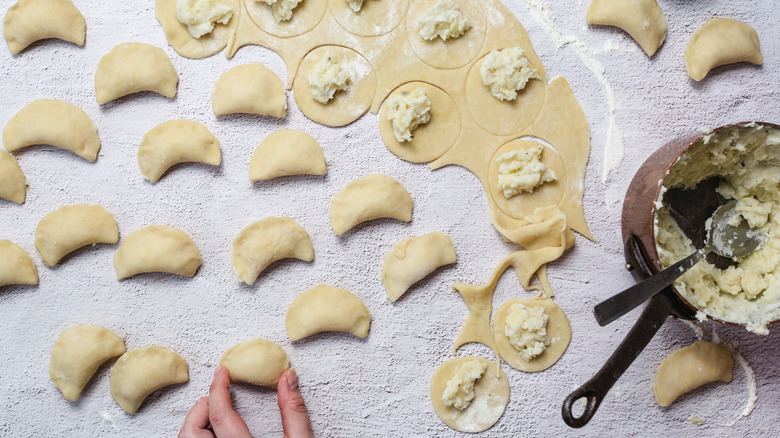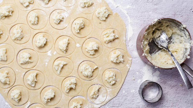 For the filling, you can use canned potatoes to make the mash or even instant mashed potatoes in a pinch — some particularly love this soft texture against the dough pocket. Pre-shredded cheese saves grating time, as does buying a pierogi press or even a ravioli stamp instead of manually forming each dumpling. You can even try to steam-fry frozen pierogies in a covered pan with butter and a splash of water, like you would Chinese dumplings, until they are heated through but still crisp on the outside.