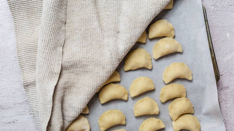 - Place the pierogis on a floured surface. Cover them with a towel.