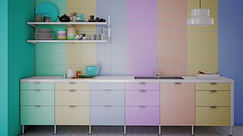 Home decor trends are changing faster than Crumbl cookies. One day, a style is in, and the next day, it lands on the list of outdated kitchen design trends you should avoid completely. If you're staring at your outdated kitchen cabinets with a serious side-eye because they're literally begging for an update, you've come to the right place. While some people might opt for a full remodel or painting the cabinets to a more modern look, for others, that's just not an option. New cabinets cost money, and if you're renting, repainting the storage units is usually a no-go. You can, however, paint the walls around the cabinets in a matching tone so as to soften the visual impact of the dated decor, creating a uniform color corner that looks and feels intentional.