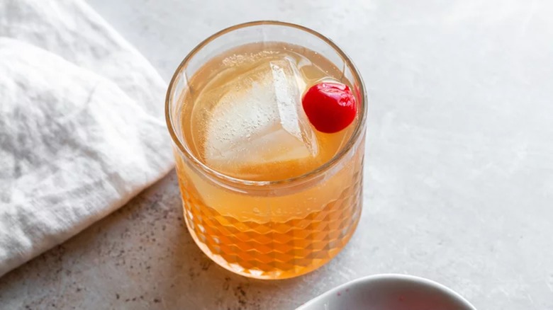 This cocktail is incredibly straightforward — its fizz comes from Prosecco and the red color comes from the syrup of maraschino cherries. Also in the mix are your bourbon of choice and kirsch, a cherry liqueur. For anyone who hasn't had it before, we know what you're thinking — however, kirsch isn't sweet like you might expect cherry juice to be. It's made by fermenting sour cherries, then distilling the result. We also love this cocktail because it's easy to adjust the sweetness level by adding more or less maraschino cherry juice, and choosing a dry Prosecco will give you a delightfully rustic-feeling night cap.