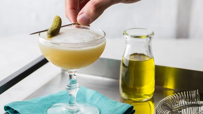 A dirty martini is one of those cocktails that might seem like a love-or-hate sort of thing, but it's worth noting that the key here is balance. Olives and brine have a strong flavor, so the first time around, you're better off adding a little bit at a time and tasting as you go. The same thing applies to our pickle juice whiskey sour, which can also be made with bourbon. We'd suggest a rye-forward bourbon with a spicier flavor profile to make the most of this unique cocktail.