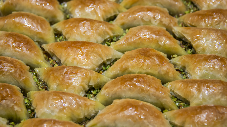 While it's common to see baklava in Middle Eastern countries, like Turkey and Lebanon, Greek baklava has several identifiable features that make it unique. The Greek preparation often utilizes walnuts, while other kinds of baklava use other types of nuts, like pistachios. Greek baklava also often includes ground cinnamon and honey, the latter of which contributes to the baklava's notable gloss and makes it sweeter than other regional preparations. You'll often find it sliced into large triangles, whereas Turkish and Lebanese baklava is often cut into squares, diamonds, cylinders, or sometimes triangles. In Greece, baklava is a bakery and pastry shop staple, but it's also served on special occasions and during festive seasons.