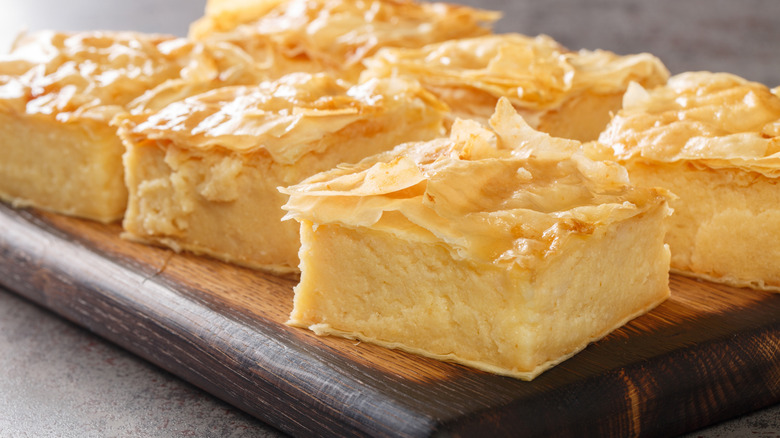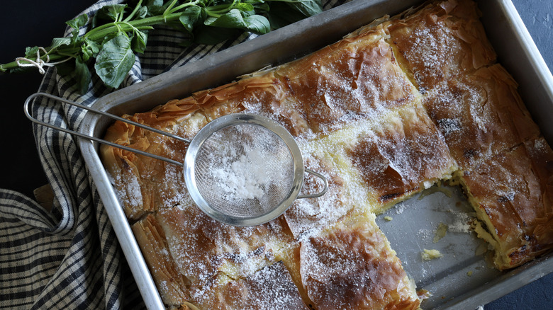 You can eat bougatsa at any time of day, and the absence of syrup makes it more breakfast-friendly than a galaktoboureko. Bougatsa is made with phyllo dough and a vanilla and semolina custard. It's also common to add orange or lemon zest to the custard for a hint of zingy flavor. Once out of the oven, the flaky phyllo pastry is dusted with powdered sugar and cinnamon. Buttery, creamy, and crunchy — what's not to love?