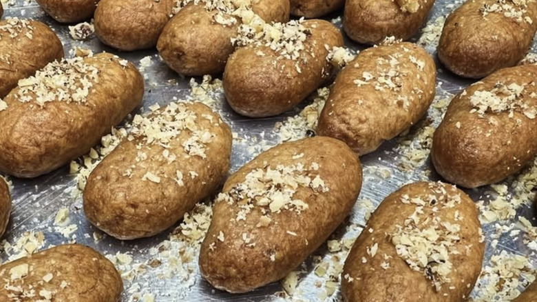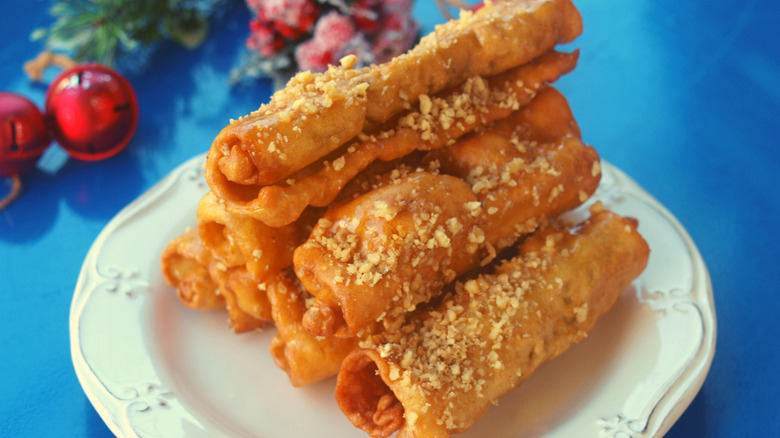The Greeks love syrup-soaked desserts — including melomakarona. Melomakarona are cookies soaked in honey syrup; makarona comes from the Greek word "makaria" meaning "blessed." Unlike a lot of cookie recipes, melomakarona call for olive oil instead of butter. The other ingredients are sugar, orange juice, honey, cognac or brandy, and spices like cinnamon or cloves, though some recipes also call for semolina. In addition to being soaked in the honey syrup, it's traditional for melomakarona to be covered with chopped walnuts.