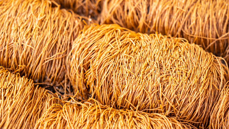 While kataifi shares similar flavors to other Greek desserts like nuts and syrups, it looks very different. The uncooked pastry looks like angel hair pasta and resembles shredded wheat after it's baked. The pastry bundles are buttery, decadent, and have a delightful texture.