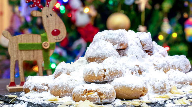 Kourabiethes, powdered-sugar-covered almond shortbread cookies, are hugely popular around Christmastime in Greece. You'll find these in any Greek bakery during the festive season, and they're easy to bake at home, too. They're made with pantry staples like eggs, butter, vanilla, all-purpose flour, and baking powder.