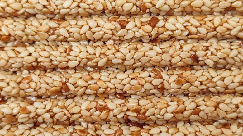 Pasteli is a sesame and honey bar that may have originated as far back as the 3rd century. This snack is so common that you might not even realize that it's Greek. In fact, you can find packaged versions of this snack both in Mediterranean delis, bakeries, supermarkets, and in U.S. stores. And it's no wonder why — they're simple and delicious. Pasteli requires only a few ingredients: sesame seeds, sugar, honey, and almonds, though other nuts are often substituted. Like most Greek desserts, it's typical to see versions with additional spices or citrus.