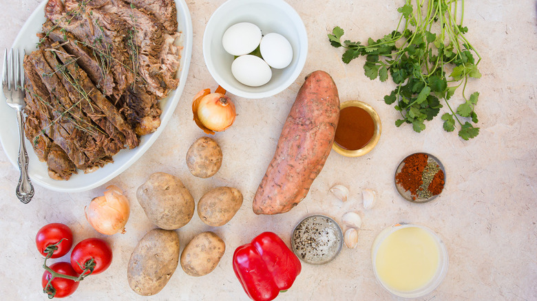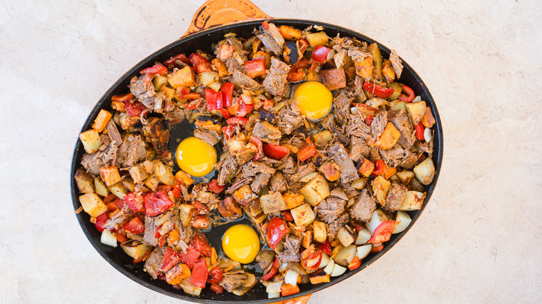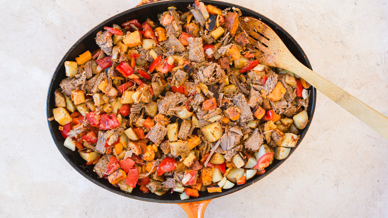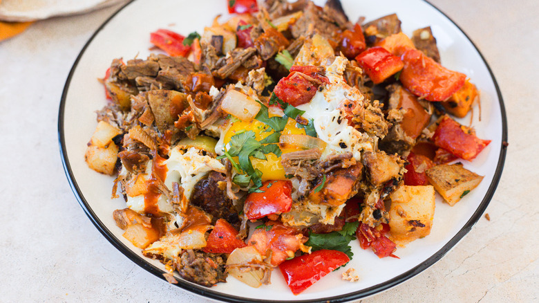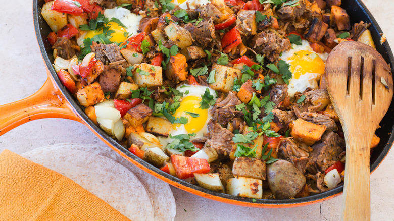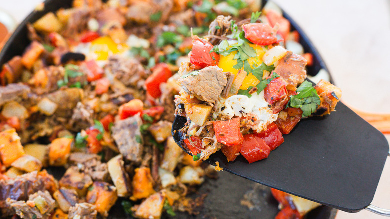To make this double potato and brisket breakfast hash, you'll need a large sweet potato, some russet potatoes, duck or chicken fat — our preference is for duck fat — diced onion, a red bell pepper, garlic, dried oregano, smoked paprika, cayenne pepper, tomatoes, flaked sea salt, and freshly ground black pepper, to make the hash and seasoning. Of course, the main ingredient is leftover cooked brisket, which will be joined by eggs for the protein quotient. For serving, top the dish with chopped cilantro, and, if you like things hot, your favorite Mexican hot sauce.