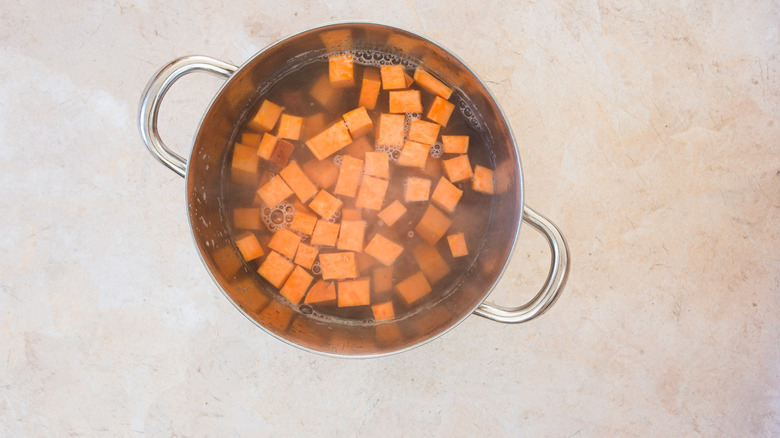 - Blanch the sweet potatoes in salted water until just tender, about 5 minutes each.