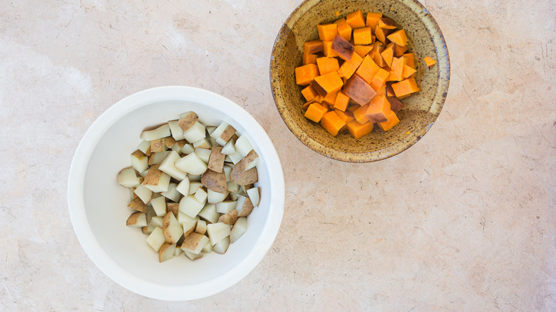 Add the potatoes and sweet potatoes in a single layer and cook undisturbed until crisp on the first side, about 5 minutes.