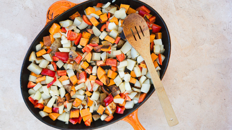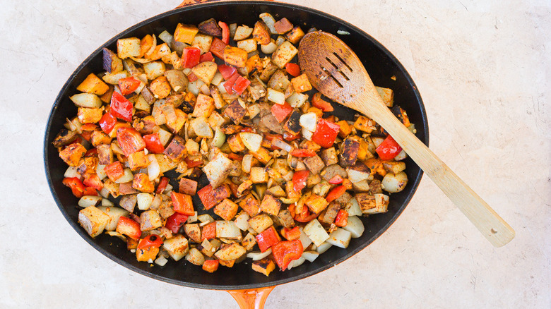 If you're not a fan of one or more of the ingredients in this recipe, fret not — there's plenty you can do to make it your own. First off, to save time, you can start with pre-cut and cooked frozen diced hash browns. Those little cubes will save you plenty of chopping and cooking time. You can still cook and add the sweet potatoes for their amazing flavor, or you can skip them altogether if you're short on time. You can also use all sweet potatoes to lower the glycemic value of the dish and make it a bit more nutritious, or sub them with diced rutabaga or turnips for fewer carbs.