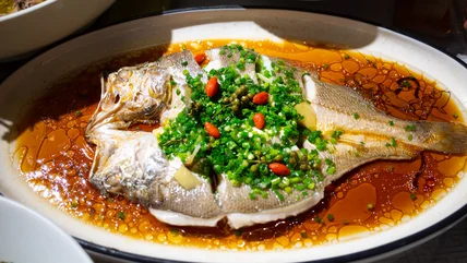 Because steaming fish the Chinese way results in such a soft and delicate texture, the fish is really allowed to shine. "The fish is simply seasoned with salt before cooking, steamed in its own juice, [then] sauce and a hot oil sizzle is poured over the fish after it's steamed. It showcases the steamed fish in its natural form. The freshness of the fish is crucial for the success of this dish," Chung says.