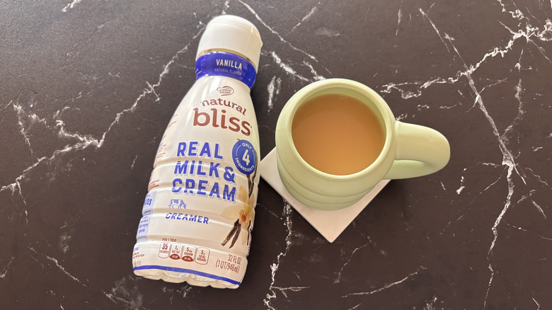 The real distinction between the Natural Bliss vanilla creamer and the plain Coffee Mate vanilla creamer is that this one has significantly fewer ingredients. In fact, the Natural Bliss vanilla creamer has only four total ingredients, which are skim milk, cream, sugar, and natural flavor. So, this creamer is a great option for those who can't live without that splash of creamer in their coffee every morning but are concerned with added oils or preservatives. Indeed, this creamer is about as bare bones as it gets, but that doesn't mean that flavor is skimped on here. The flavor is just as good as the regular Coffee Mate vanilla flavor, with strong creamy notes shining through and subtle vanilla notes to back it up — making for one tasty cup of joe.
