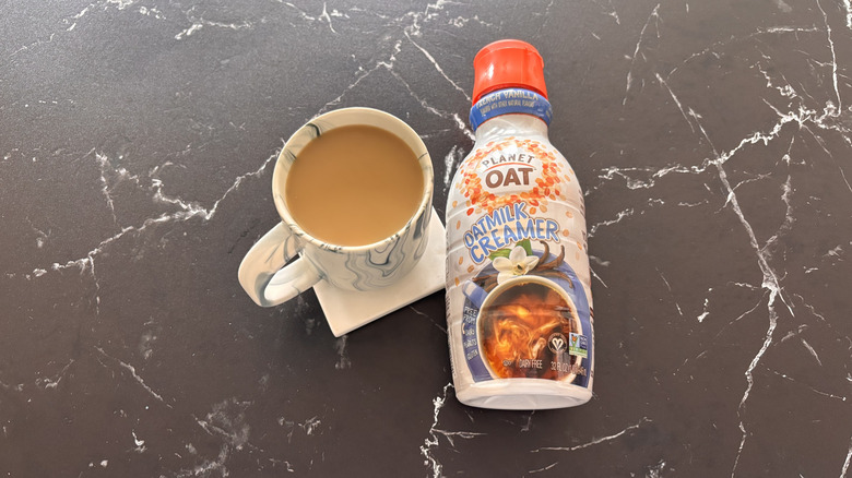 If there's one brand that's going to nail an oat milk creamer, it only makes sense that it would be one called Planet Oat. Indeed, the final creamer highlighted on this list, the Planet Oat French vanilla oat milk creamer, has a lot to offer a humble cup of coffee. It can be hard to choose a creamer to go with when there are so many on the market, but if you particularly want one that has a notable oaty flavor to it, then this is the one to grab from the store shelf.