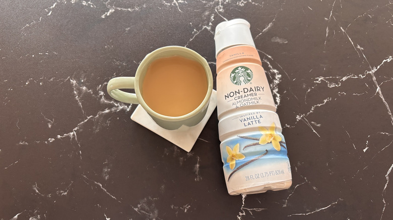 Long gone are the days of only being able to enjoy Starbucks flavors at a Starbucks location. There's a whole world of store-bought products from the popular coffee chain out there, from whole bean coffees to Starbucks bottled and canned coffees to an impressive array of Starbucks coffee creamers. Amidst a lineup of creamers that include dairy, Starbucks has also forayed into the world of non-dairy creamer options, as represented by its almond milk and oat milk non-dairy vanilla creamer, inspired by its classic vanilla latte.