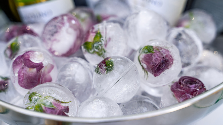 Perhaps you wouldn't think to top your frozen cocktail with more ice, but frozen ice spheres can be a really effective garnish when used properly. Ice can be a great way to add decor, and if you include florals, herbs, fruit, or candy inside them, they can be a great way to introduce more flavor. They'll look like little glass shapes on top of your cocktail and keep your drink cold for longer. This is an extra bonus, as frozen cocktails tend to melt quite quickly in the summer heat.