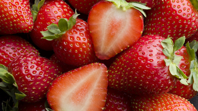 While it's a really clever idea to use frozen strawberries instead of fresh ones when making daiquiris, for your garnish, it's best to go with fresh. Frozen strawberries work great in your cocktail because they don't dilute your drink the way regular ice would. However, nobody wants to bite into a frozen strawberry. A fresh strawberry slice brings a lovely chew and sweet, fruity juiciness to the experience. It also looks much better as it holds its shape well. You can cut a little slit directly into the strawberry and nestle the whole slice on the rim. Alternatively, make a strawberry skewer by threading fresh strawberry slices onto a toothpick and nestle it on top of your cocktail glass.