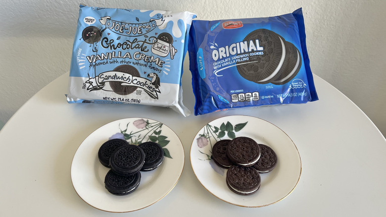 Now we move on to both brands' versions of an Oreo dupe. Trader Joe's Chocolate Vanilla Creme Joe-Joe's are among the brand's most popular chocolate treats. These sandwich cookies are incredibly dark; they are practically black in color. TJ's is flavored with natural flavors and lists vanilla bean specks as one of the ingredients, which is quite sophisticated for a store cookie. When you open the Trader Joe's cookie, it has obvious vanilla flecks in the creme center, giving it an elevated appearance to the otherwise white cream. The cookie itself has a rich cocoa flavor and a firm, crisp texture that snaps as you take a bite. Think about dunking a cookie in milk only to lose it at the bottom, just to have to fish it out with your fingers. In that case, the TJ's treat would hold up without falling apart.