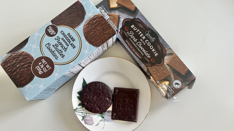 Let's start with the obvious here. These cookies are pretty dissimilar, from appearance to taste to texture. Although the Trader Joe's Dark Chocolate Dipped French Butter Cookies and Aldi's Specially Selected Dark Chocolate Coated Butter Cookies are both deemed butter cookies, that's where the similarities end.