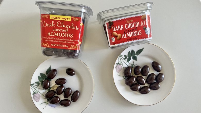 I made my decision on which is best based on factors such as taste, texture, appearance, ingredients, weight, and the value of the items — value was calculated based on cost per ounce. For example, Aldi's chocolate-covered almonds cost $4.99 for 10 ounces, and the Trader Joe's one is priced at $7.49 for 16 ounces; TJ's is a slightly better value per ounce despite the price difference.
