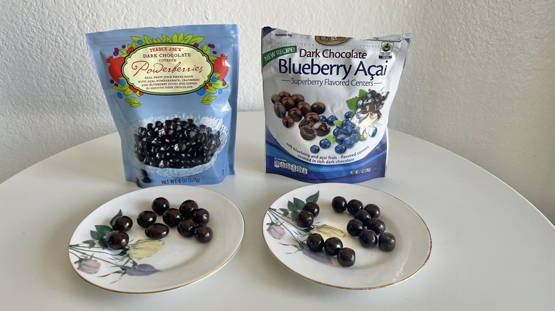 Both of these dark chocolate delights are similar to Brookside açai blueberry, which you can find at many grocery stores. The Trader Joe's Dark Chocolate Covered Powerberries come in an 8-ounce pack. The "powerberries" are made with real fruit juice comprised of açai, pomegranate, cranberry, and blueberry. The texture is very soft on the inside; the fruit piece in the center and the chocolate mesh together and melt as you chew. It doesn't give you much of a mouthfeel other than chocolate. This is pretty sweet with a generic, mild fruit flavor. Because it's made with multiple juices, it doesn't taste like any one in particular.